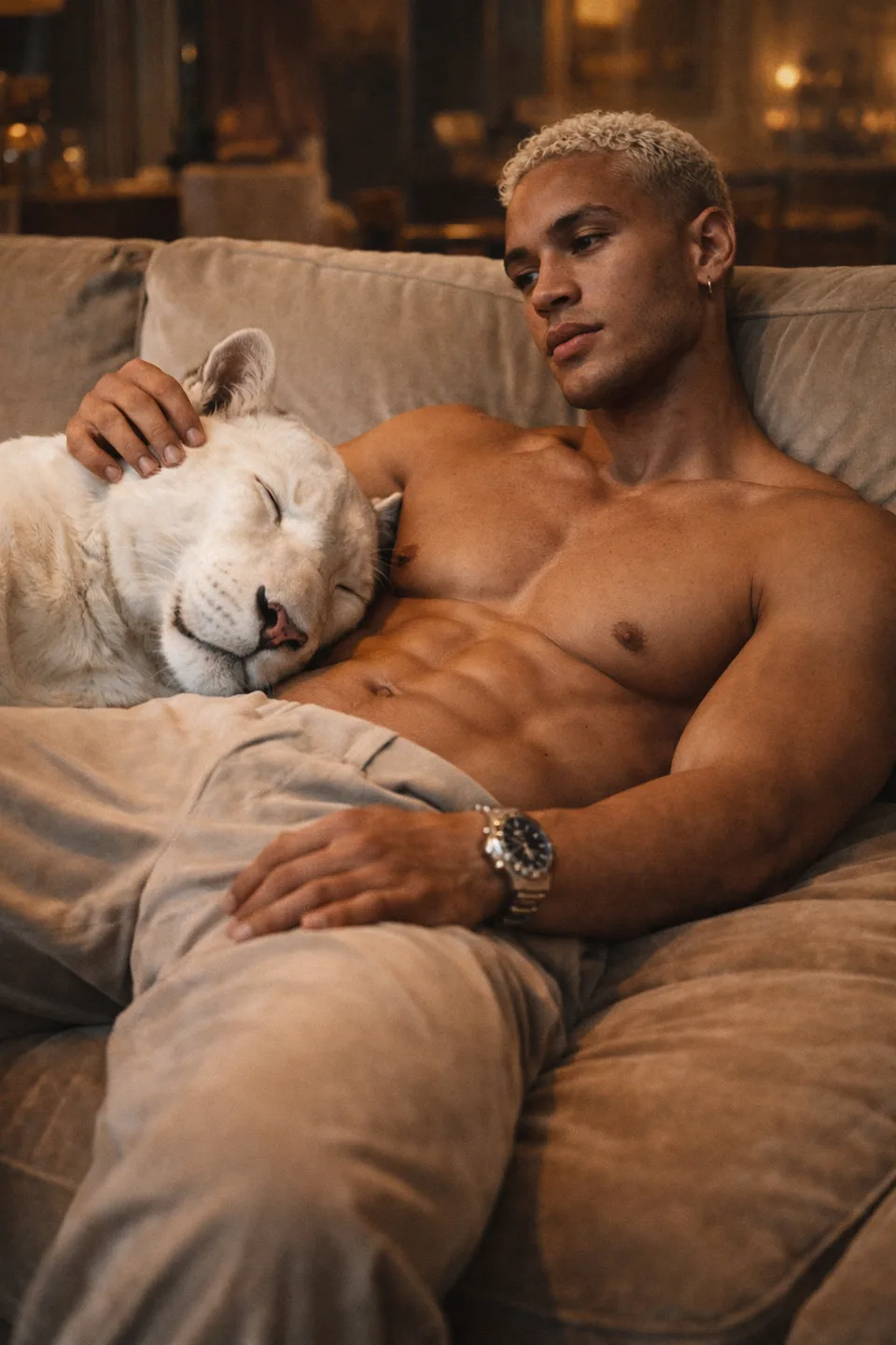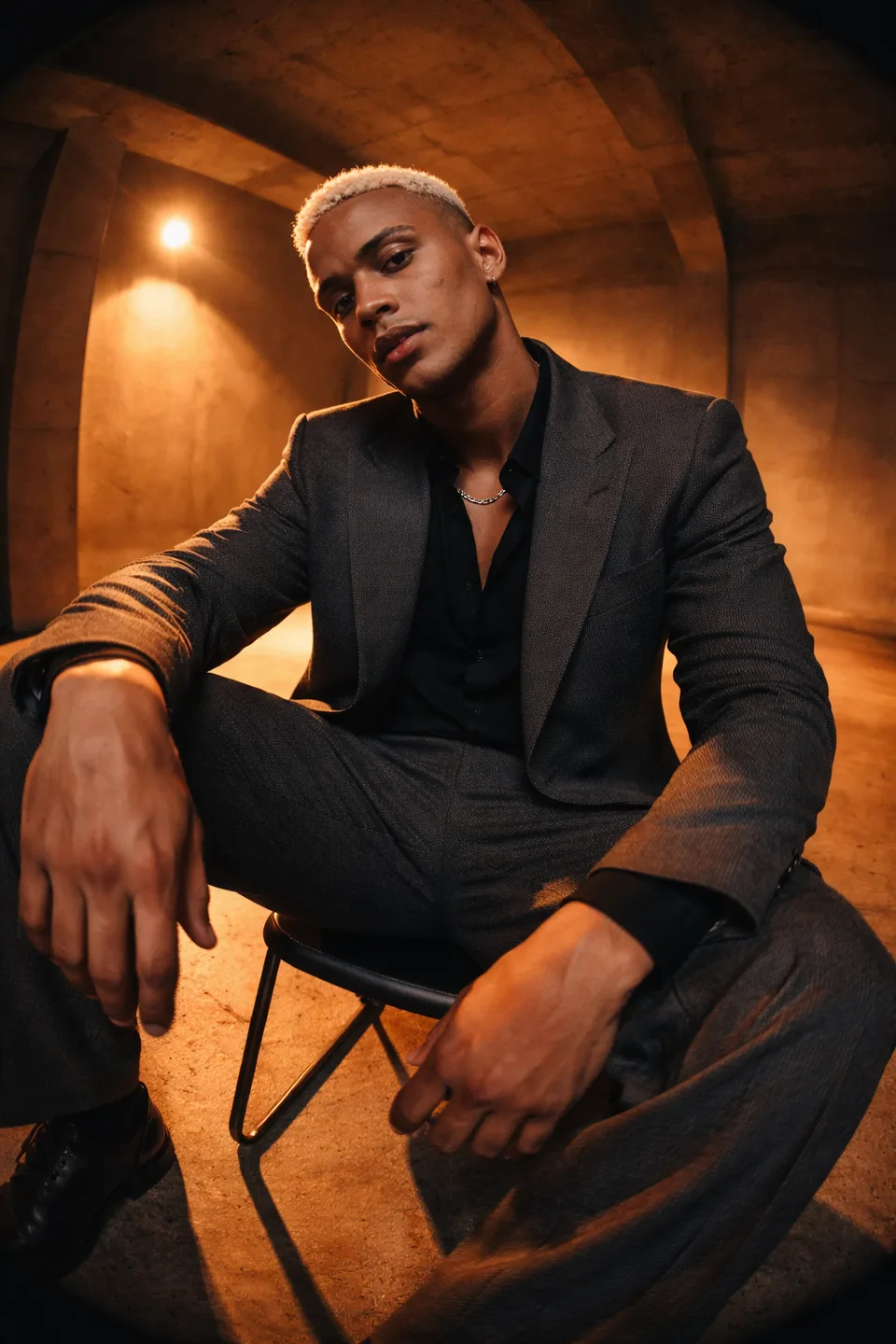 A high-angle shot, in which a male model (photo uploaded, no facial features changed) and a black horse are depicted from above, reveals the entire composition of the scene by the Icelandic river. The model stands relaxed in an oversized sports milky suit and black leather boots, carefully positioned in relation to a horse drinking water. The riverbank, rocks and moss create a natural pattern beneath them. Laconic, minimalistic design in the style of fashion editorial with balanced negative space, soft visualization using an airy brush, muted contrast, preservation of natural skin texture, slightly enhanced green tones in the landscape, soft natural lighting in cloudy weather. Hasselblad 85mm overhead projection, 9:16 vertical, serene exterior aesthetics, high 8k quality