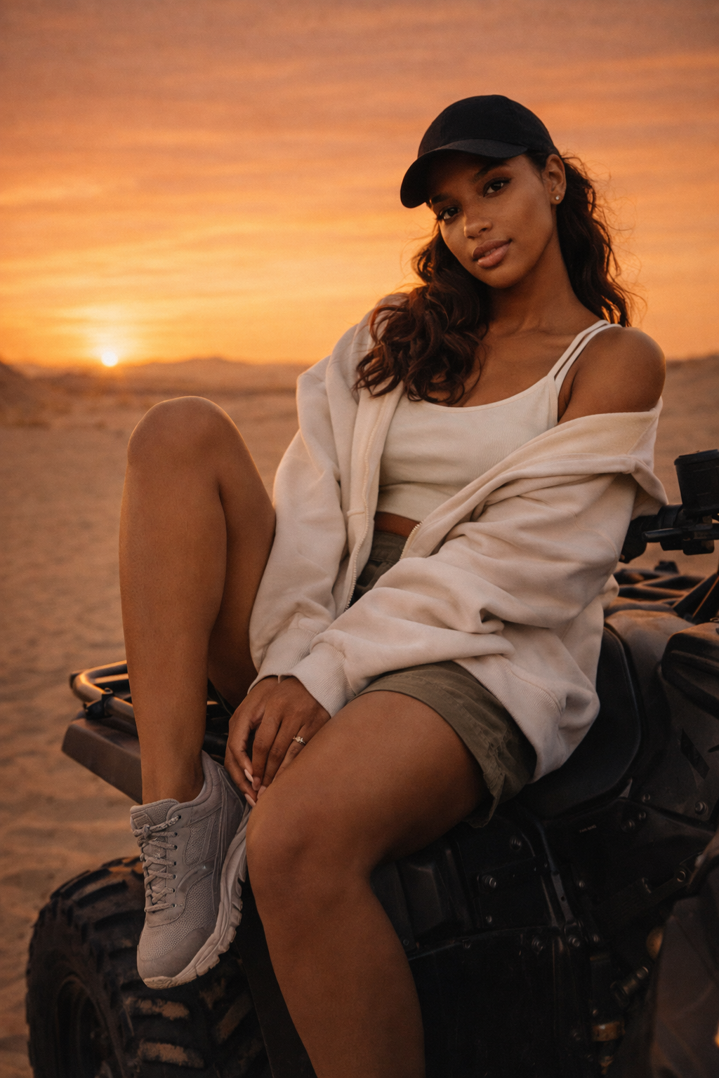 The photo is taken in the style of a fashion shoot against the backdrop of a desert landscape at sunset. The color scheme is warm, dominated by shades of sand and orange sky, creating a soft and warm atmosphere. The woman (photo uploaded, facial features must not be altered) sits on a black ATV, one leg resting on the footrest, the other bent at the knee. She is wearing a white top with thin straps, olive shorts, and an oversized white sweatshirt. She is wearing a black baseball cap and gray sneakers. Her pose is relaxed and confident.